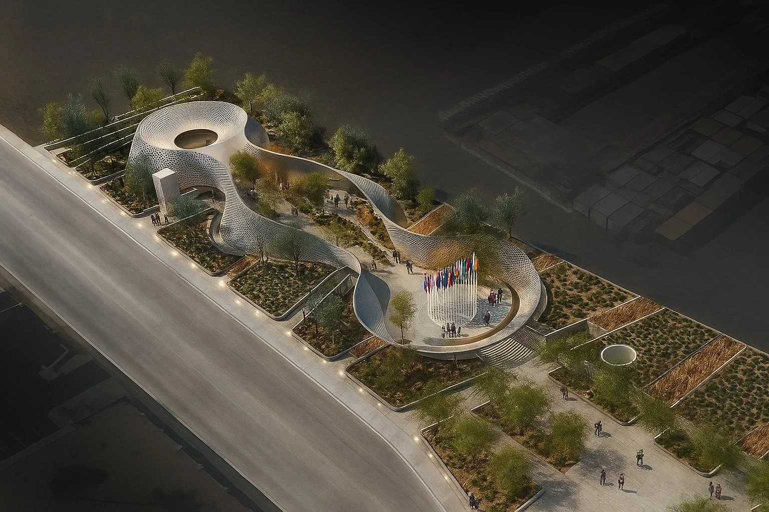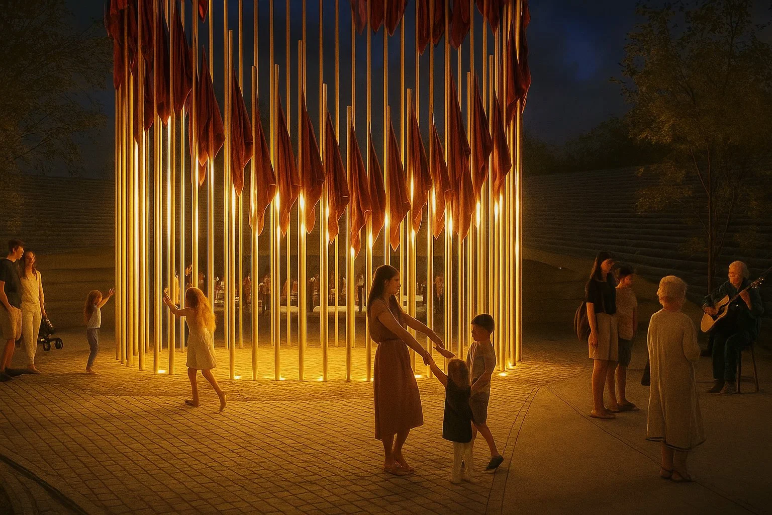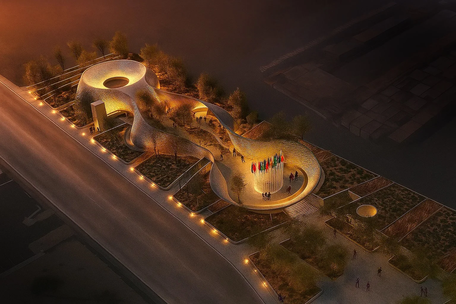 The Unity Ribbon rises from the ground in harmony with its setting, its form balancing strength and transparency. It creates a sacred space of remembrance, shielding visitors from the city’s pulse while maintaining openness and connection to the surrounding environment.