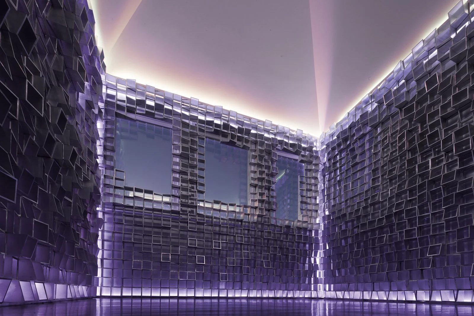 Thousands of geometric metal cells form a shimmering lattice that oscillates between opacity and transparency. By day, the tower refracts sunlight into kaleidoscopic fragments, shifting with weather and time. By night, it becomes a luminous clockwork. At 8:45 pm, a concealed LED system cycles through minute-long transitions, from silver-blue to violet to deep reddish-blue, before extinguishing into darkness. This ritual resets time perception, heightening spatial memory and transforming the structure into a marker of passage.