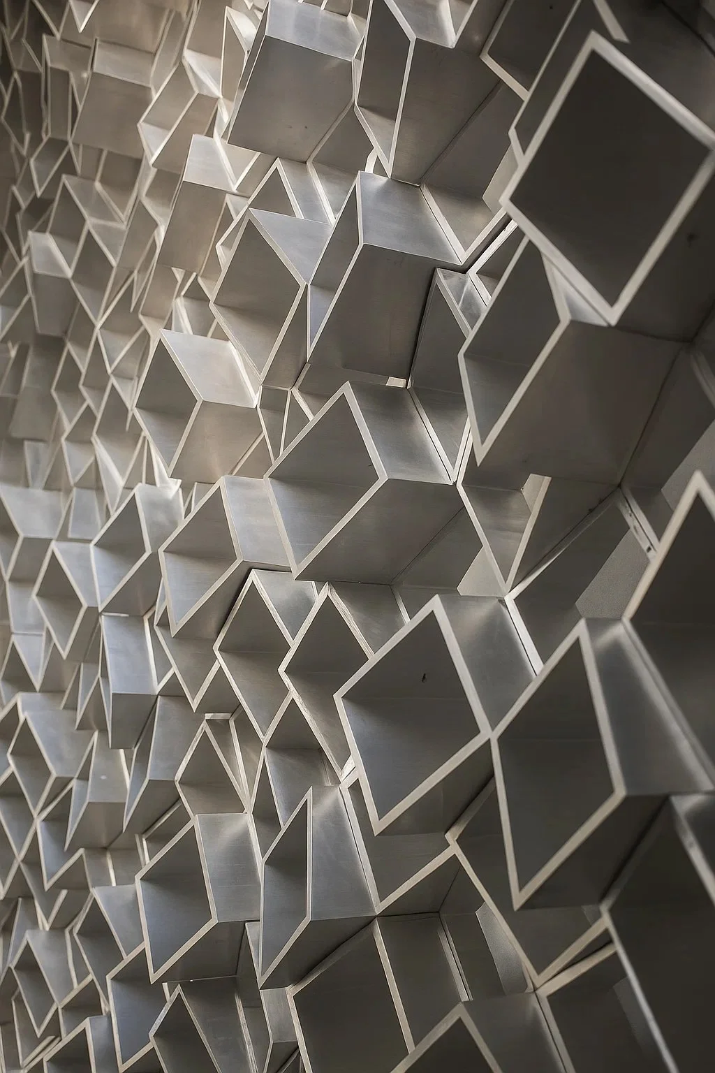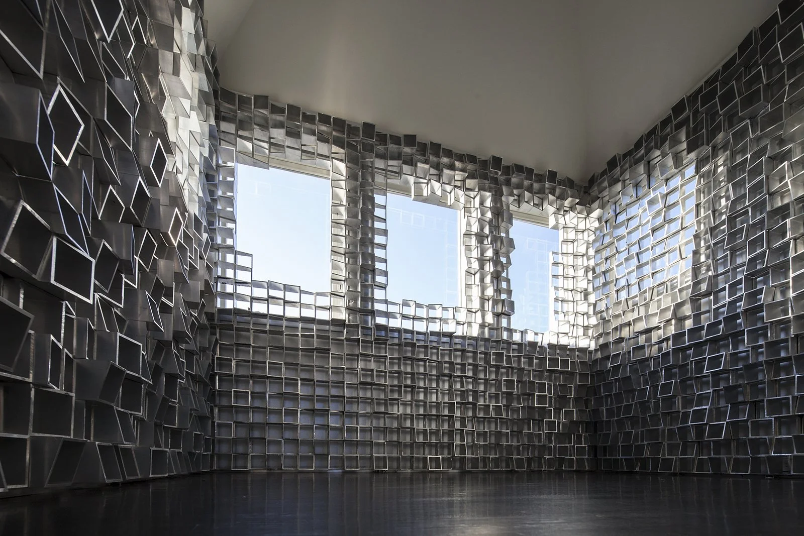 Visitors ascend a circular stair into a suspended super-cube lined with 3,000 marine-grade aluminum extrusions arranged in fragmented pixelation. Apertures frame fleeting views of ocean and mountain, while reflective surfaces distort and multiply them. The geometry creates a paradox of compression and vastness, intimacy and immensity.