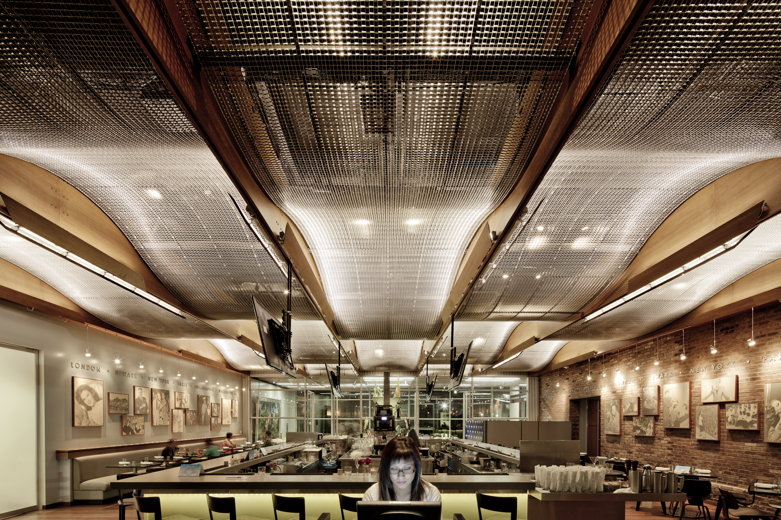 At its heart is a sweeping curved metal-mesh ceiling, suspended like a continuous ribbon of motion. Its undulating form recalls the rhythmic belt wheels of military tanks—a literal and symbolic reference to the machinery that powered the war effort and the innovations that followed. By day, sunlight filters through the perforated mesh, casting animated patterns across the space; by night, integrated LEDs trace its contours, echoing the Museum’s Canopy of Peace above.
