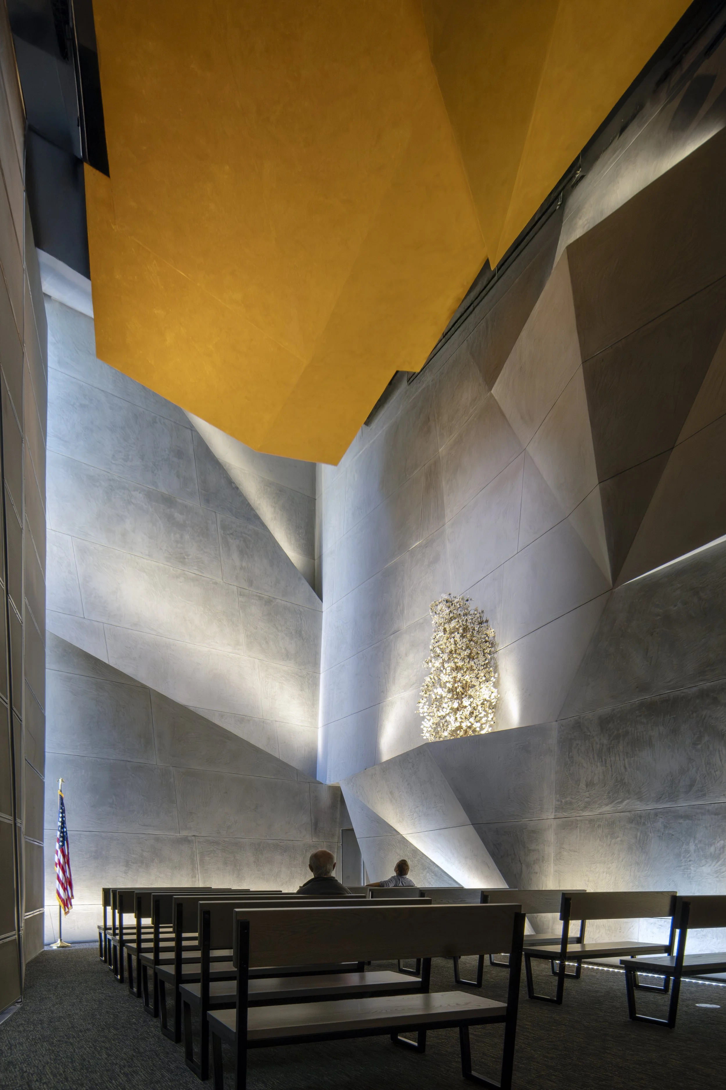 Filtered daylight enters through vertical slits and a clerestory above the altar, creating a rhythmic choreography of light and shadow—an architectural metaphor for remembrance and hope. The Chapel’s interfaith inclusivity makes it a universal space of mourning and gratitude, open to visitors of every faith and background.