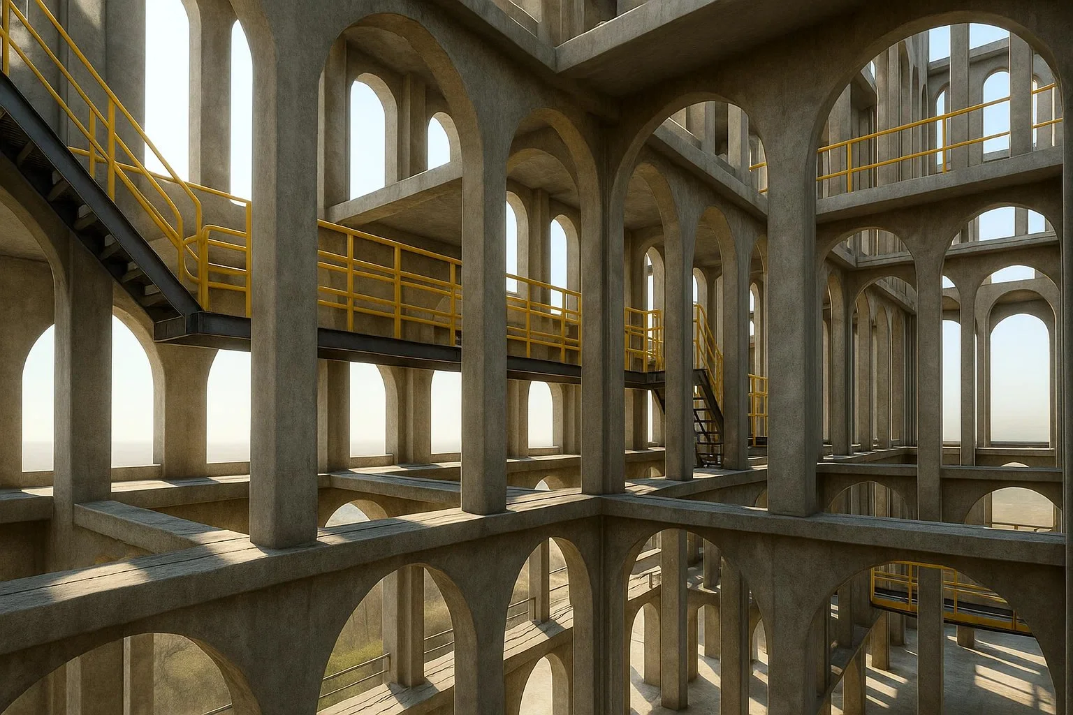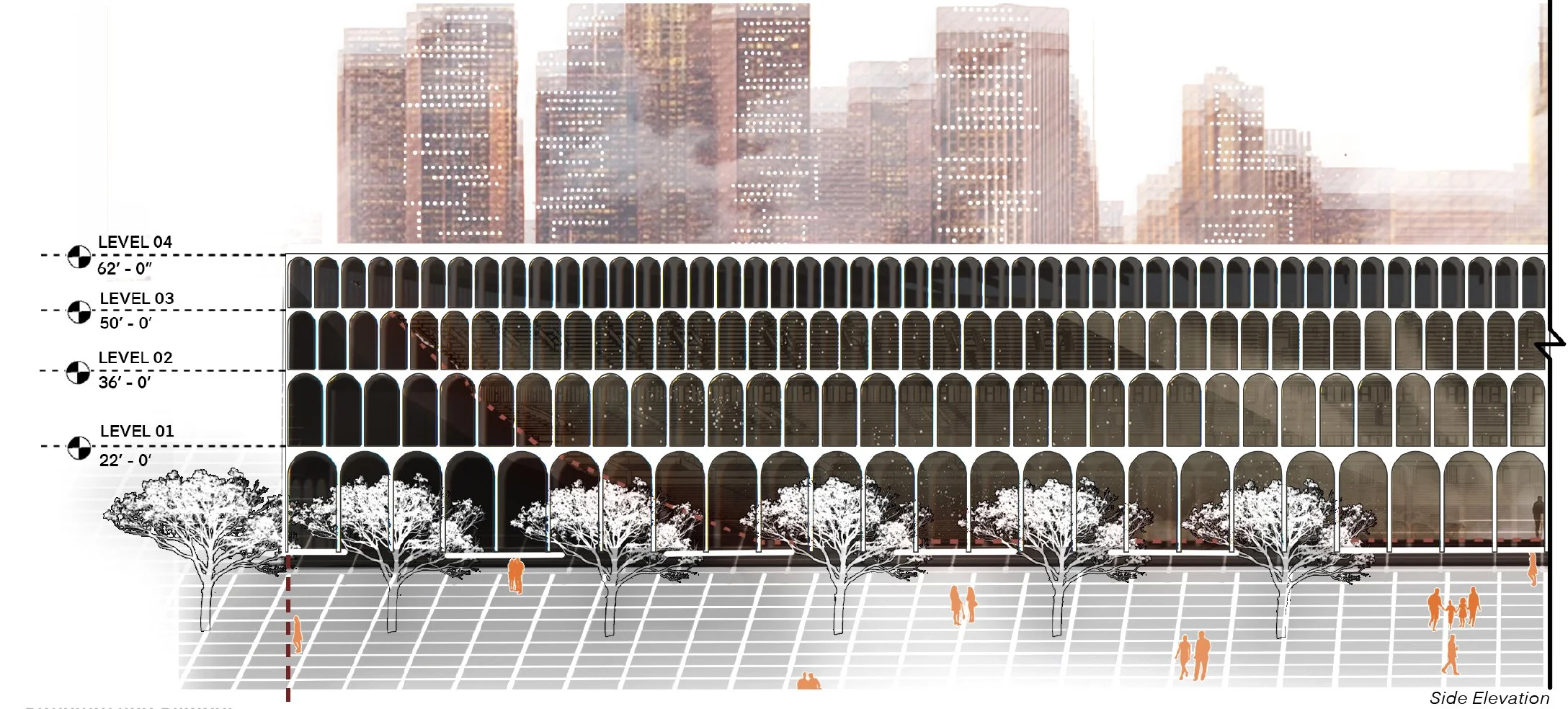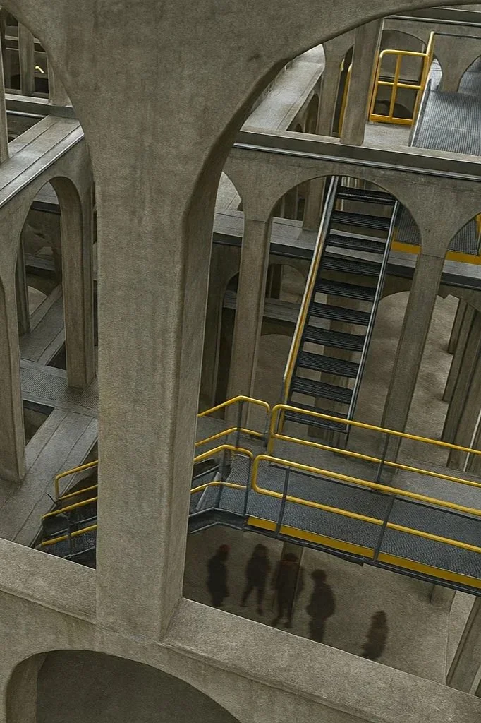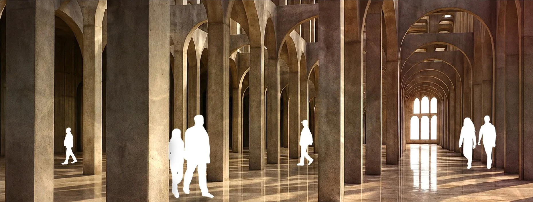 The result is a layered architecture that expresses both containment and revelation, signaling that something sacred unfolds within its perimeter. At its heart lies an elevated performance bowl, visible through cascading, rhythmic layers of stacked arches that wrap the structure in depth, light, and shadow.