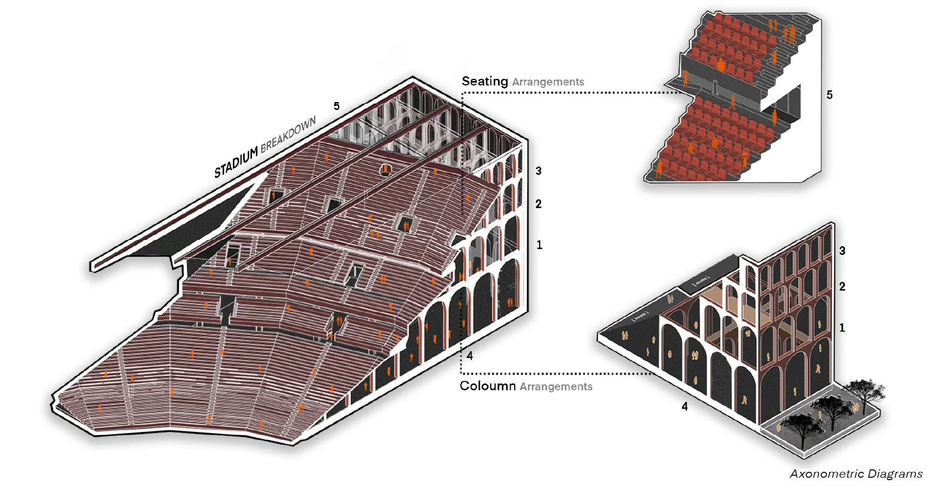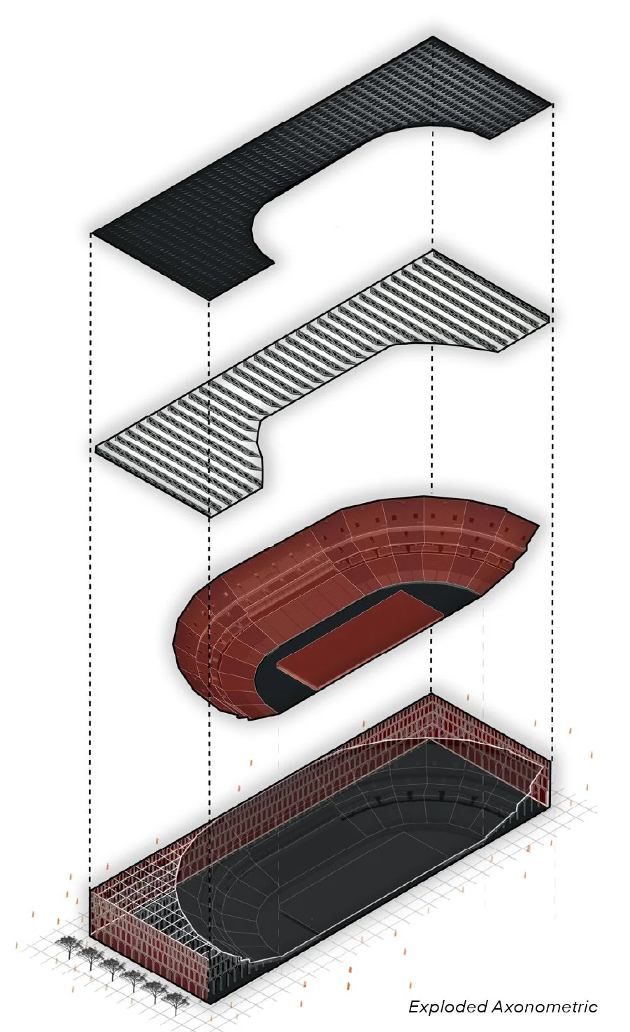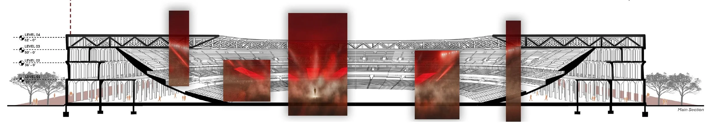 From the open arenas of ancient Greece to the monumental amphitheaters of Rome, stadiums have long embodied the collective human experience. The Colosseum, in particular, became a conceptual reference: its layered arches, civic grandeur, and enduring presence resonating across millennia. Our design reinterprets this legacy in a contemporary architectural language—honoring the past while projecting confidently toward the future.